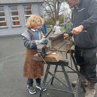 We had a very interesting visit from a blacksmith today . Richard from Heritage in Schools came with portable forge and anvil to show us a small piece of blacksmith craft. We made a pendant and a brooch from history. We got to use the bellows to heat the fire and hammer to flatten it into shape. Richard showed us how to create curved lines and demonstrated the chisel and tongs.