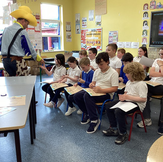 We had a brilliant visit from the Seatbelt Sheriff to remind us all about road safety. He was very funny and we all really enjoyed it. We got certificates and badges to be sheriffs at home.